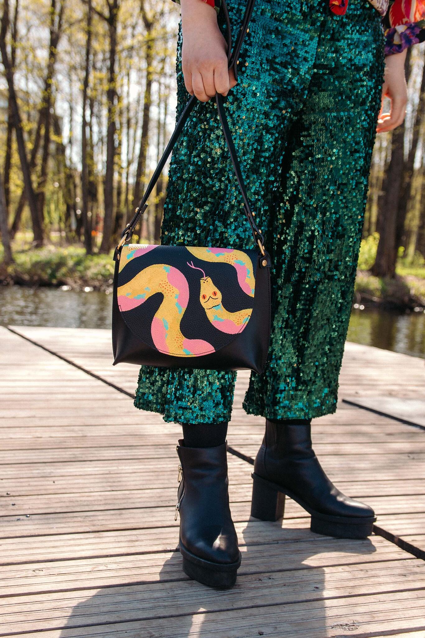 Krõõt’s art has humor in it – she likes to play with colors and depict animals in silly positions with funny messages. Her creation very much talks the same language as her art – she smiles a lot, spices up her conversations with jokes, yet takes no bullshit. She is a mother of 3 devily angels that she carries around in a cargo bike in old Soviet sleeping area while wearing glitter from nose to toe. She sparks up her life not only for herself and her family but also for others with the witty illustrations that you can now proudly start wearing yourself by buying one of those art bags!