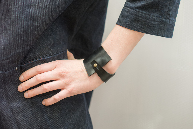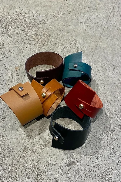 Hug your arm with this simple yet expressive leather wristband. It goes around your wrist once and can be closed with a simple screw-button.
