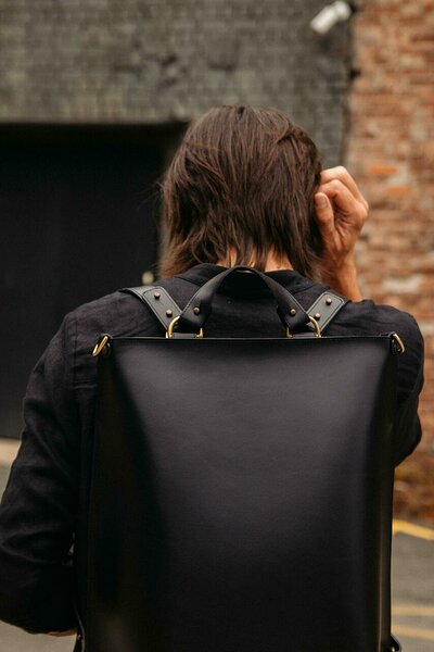Sleek and practical, this is the larger version of our legendary leather backpack. It feels at home on your back, tossed over the shoulder, or swinging from your hand. (Those versatile straps know the assignment.) It has a zipper on top, two inside pockets and a laptop bay.